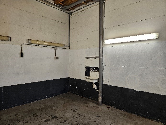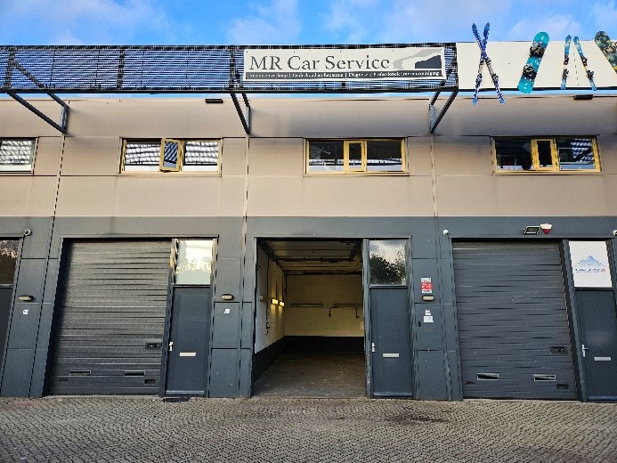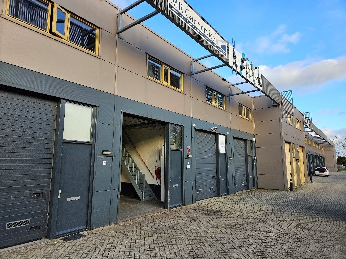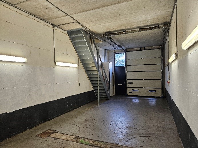 De unit is voorzien van een hoge overheaddeur (ca. 3,50 m), ideaal voor laden en lossen, en beschikt over twee parkeerplaatsen op het gemeenschappelijke buitenterrein.